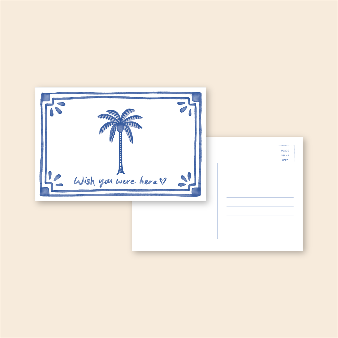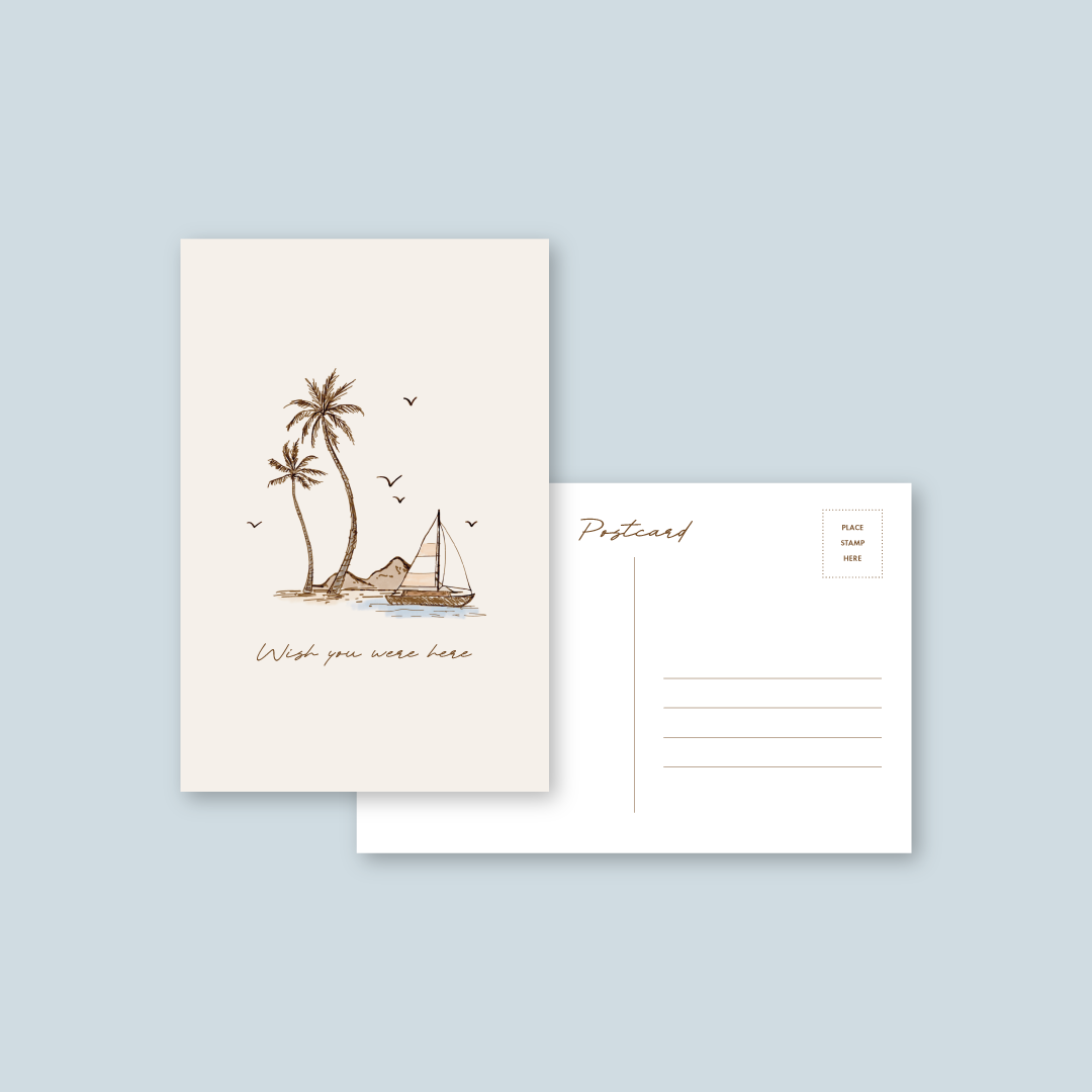 Ocean Palm Tree Postcard (natural texture, recycled cardstock) | No Packaging - $2.25 MSRP $4.50; Clear Sleeve - $2.40 MSRP $4.50, 6 minimum | 4” x 6” (10.16 cm x 15.24 cm)