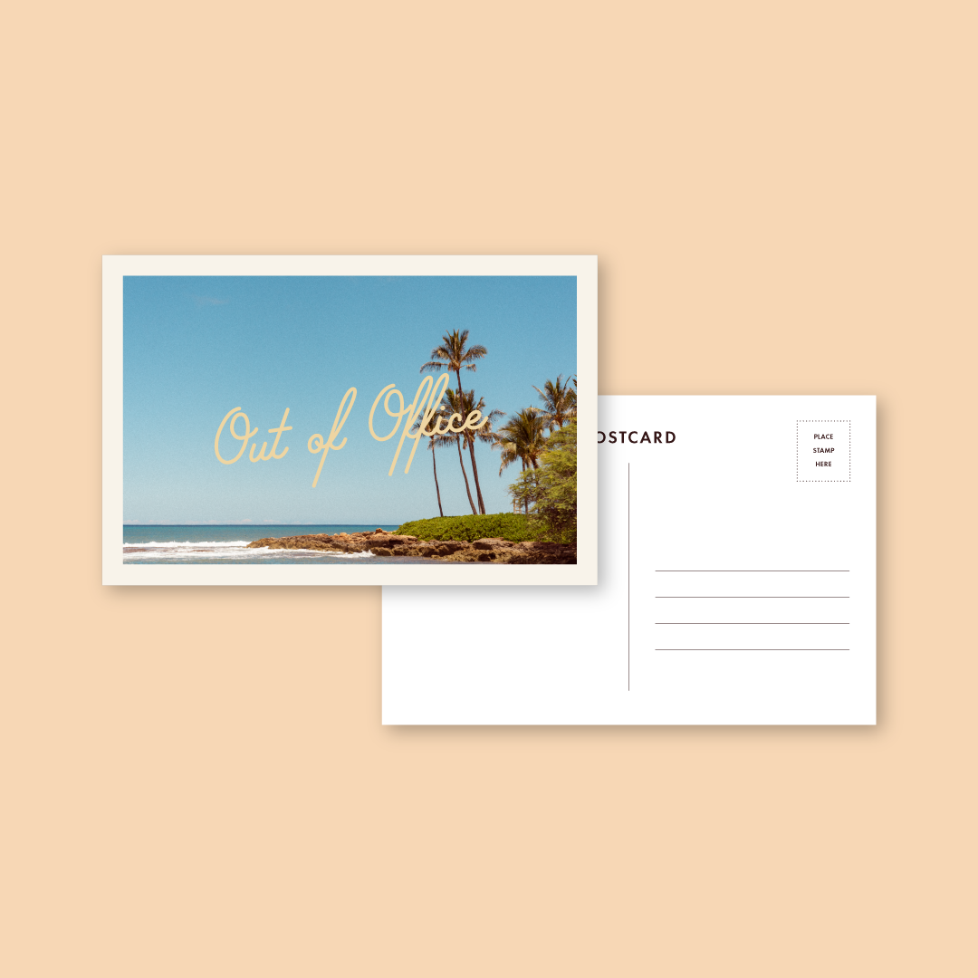 Out of Office Postcard (matte cardstock) | No Packaging - $2.25 MSRP $4.50; Clear Sleeve - $2.40 MSRP $4.50, 6 minimum | 4” x 6” (10.16 cm x 15.24 cm)